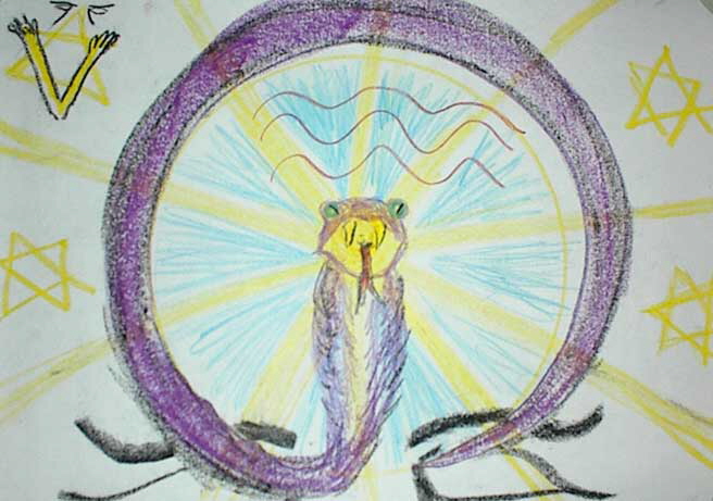 Beispiel einer Öffnnug des sechsten und siebten Chakras durch Kundalini. Energie, die in den ersten Chakras als Sexualität erscheint, wird hier zur Vereinigung mit dem Göttlichen.